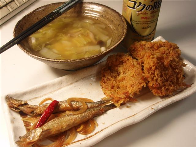 ししゃもの南蛮漬けと掻き揚げ名前らしく揚げ物にしてみた。