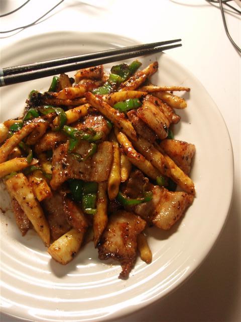 ちなみに、姫竹とは実家のあたりでの名称らしく、ここらへんでは細竹といったりするらしい。 要は、細いたけのこである。 <スポンサードリンク> 材料 ・姫竹100g ・塩豚100g ・ピーマン1個 ・味噌大匙1 ・ドウチジャン小さじ1 ・テンメンジャン小さじ1 ・背脂1個 ・みりん小さじ2 1.姫竹を斜めにスライスして、4等分くらいにする。塩豚は塩水に漬けて、塩抜きしてからスライス。ピーマンは千切り 2.背脂を鍋に入れて、弱火にしてラードを搾り出す 3.十分にラードが出たら、塩豚を入れ炒める 4.姫竹をいれ炒め合わせ、味噌、ドウチジャン、テンメンジャンを入れる 5.ピーマンをいれ、軽く炒め合わせたらみりんを入れ、ひと混ぜして皿に盛る。甘辛くてウマー PR ▽▼▽美味しそうだと思ったらクリックお願いします▽▼▽ ![]() ▲△▲美味しそうだと思ったらクリックお願いします▲△▲ ● コメントフォーム |