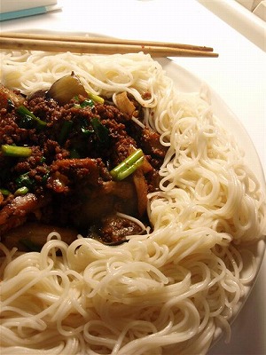 【ナスとエリンギのピリ辛炒め素麺添え】 ナスは意外と使い勝手の良い素材である。