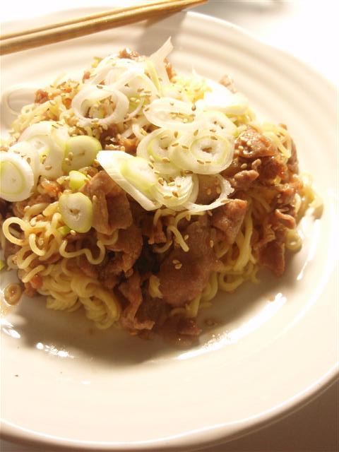 豚肉の甘辛炒め合え麺は炒めた豚肉に茹でた袋麺を合えるだけ。