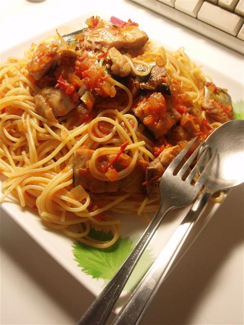 【秋刀魚とトマトのパスタ】トマト缶ではなく、フレッシュなトマトを使ったパスタである。